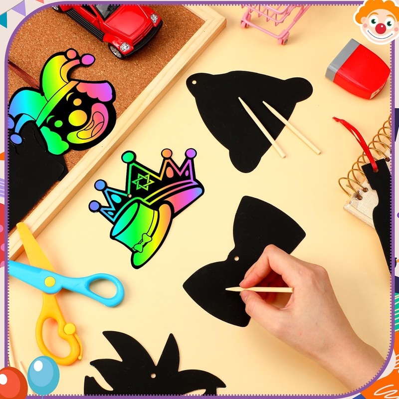 Deekin 120 Pcs Purim Scratch Paper Art Set Purim Colored Scratch Cards Hanging Rainbow Ornaments Crafts Champagne Mask Narcissus Purim Party Activities DIY Art Painting Project Supplies