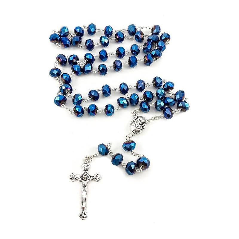 - Catholic Deep Blue Crystal Beads Rosary With Metal Crucifix Long Beaded Necklace With Madonna Medallion In The Middle And Holy Soil From Jerusalem Holy Land. Limited Edition!