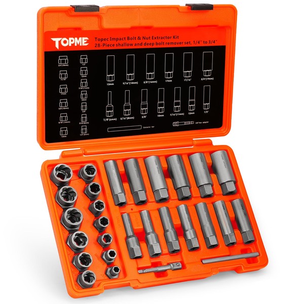 - Various Sizes:Size including 1/4",5/16"(8mm),3/8",10mm,7/16"(11mm),12mm,1/2",13mm,9/16"(14mm),5/8"(16mm), 17mm,11/16",3/4"(19mm).The deep bolt extractor set versatility ensures you have the right solution for any repair task