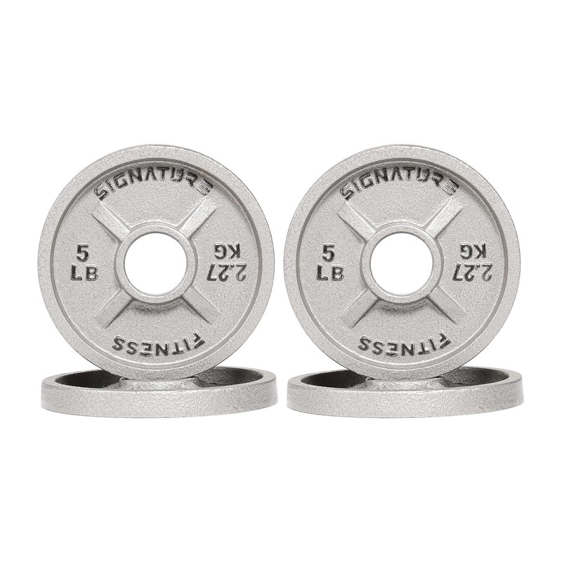 - OLYMPIC STYLE PLATES: Constructed of Solid Cast Iron with a 2-inch machine drilled hole and durable Silver Enamel finish. Simple, classic, and tough enough to endure a rock-solid workout! Note: Each weight plate has a 2-inch center hole diameter that is designed to fit on standard Olympic Barbells.