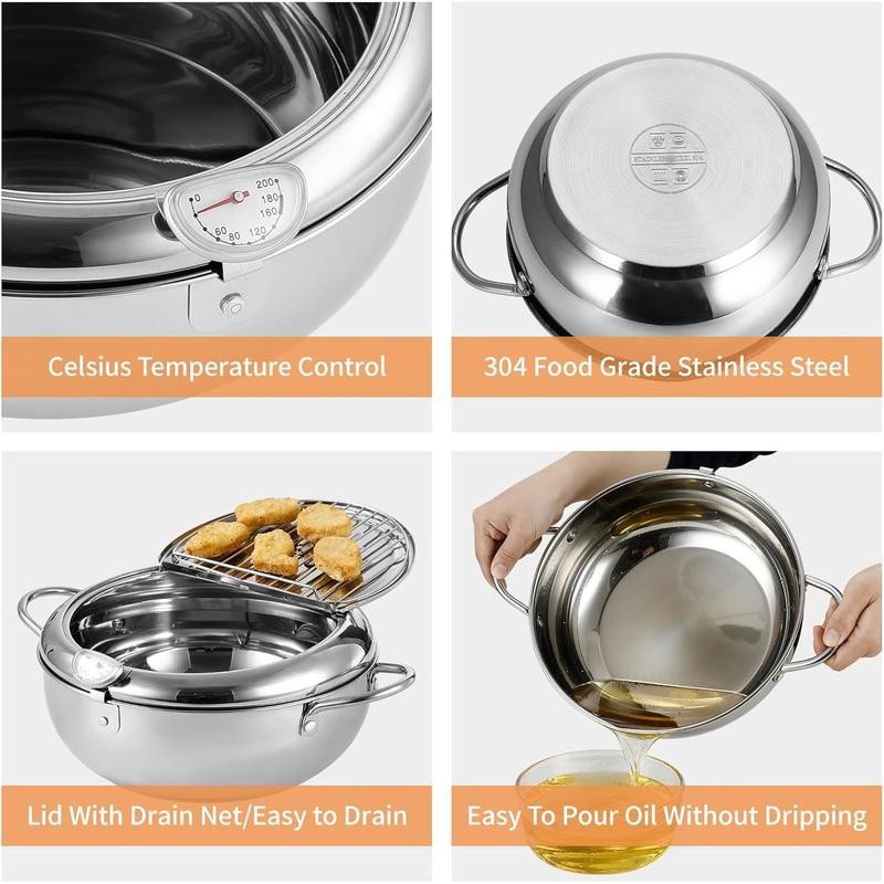 Kitchen helper: The deep frypot is made of 304 stainless steel and is durable and has good heat insulation performance. It is suitable for frying ( fries, chicken nuggets, squid, tempura, shrimp, peanuts, fish, etc).