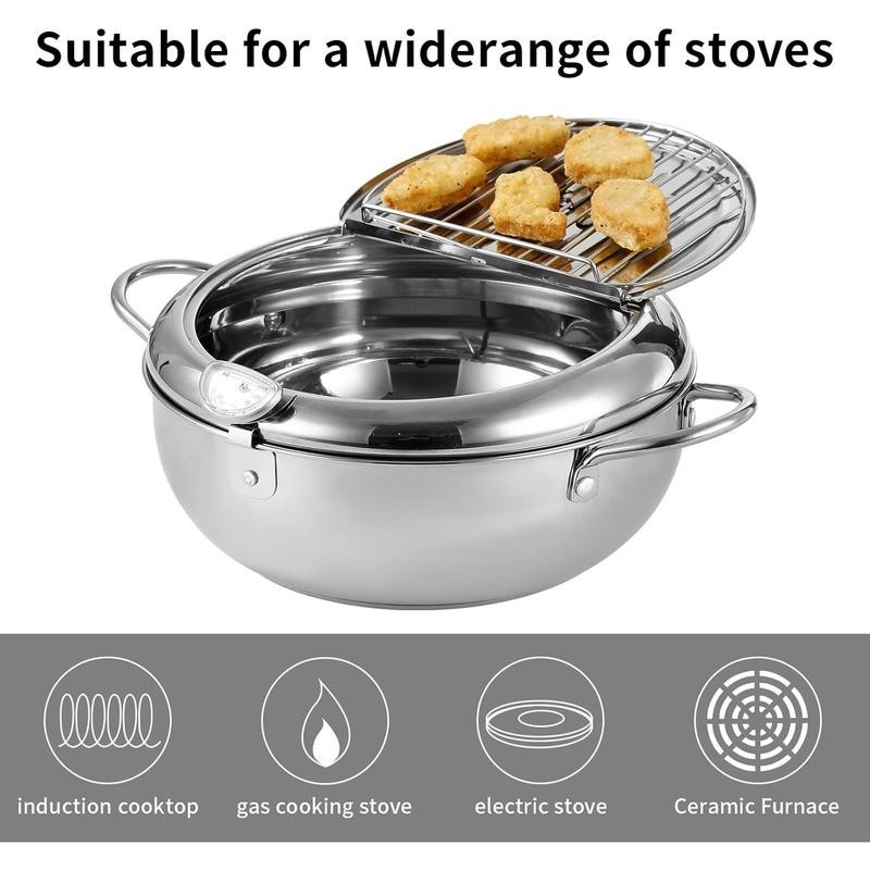 Stainless Steel Material: Our deep fryer pot is made of 304 stainless steel, which hevy-duty and reliable. This tempura frying pot Can withstand high temperatures, and the heat in the pot even. It is compatible with all cooktops, including gas stove, induction stove, electric stove fire source.
