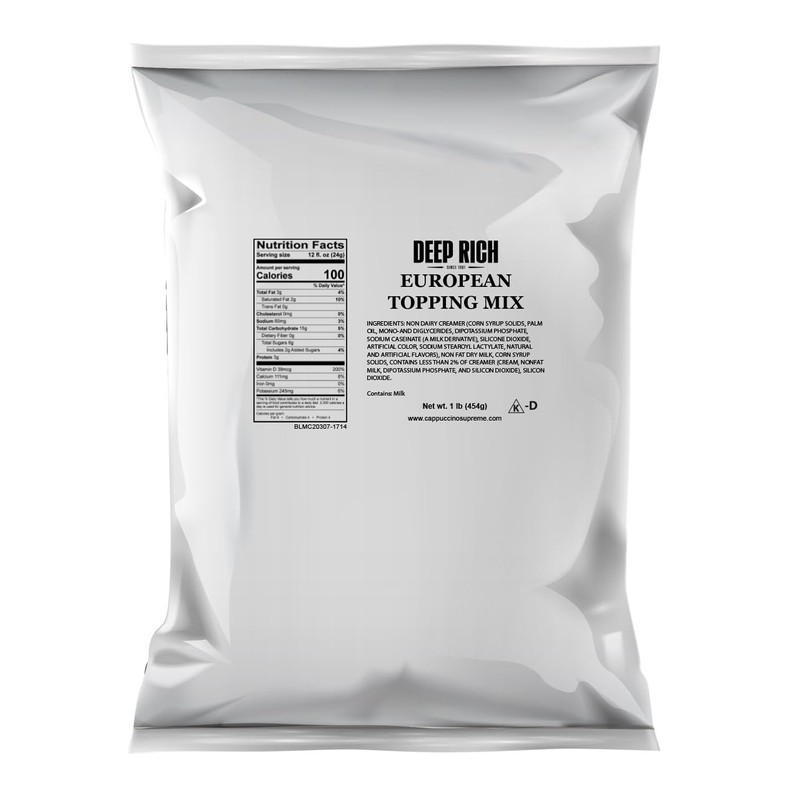 - Deep Rich European Cappuccino Topping Mix is a great powdered creamer for use in vending machines, single cup bean to cup brewers and other hot drink dispensers. It can also be used by itself as a creamer. Kosher.