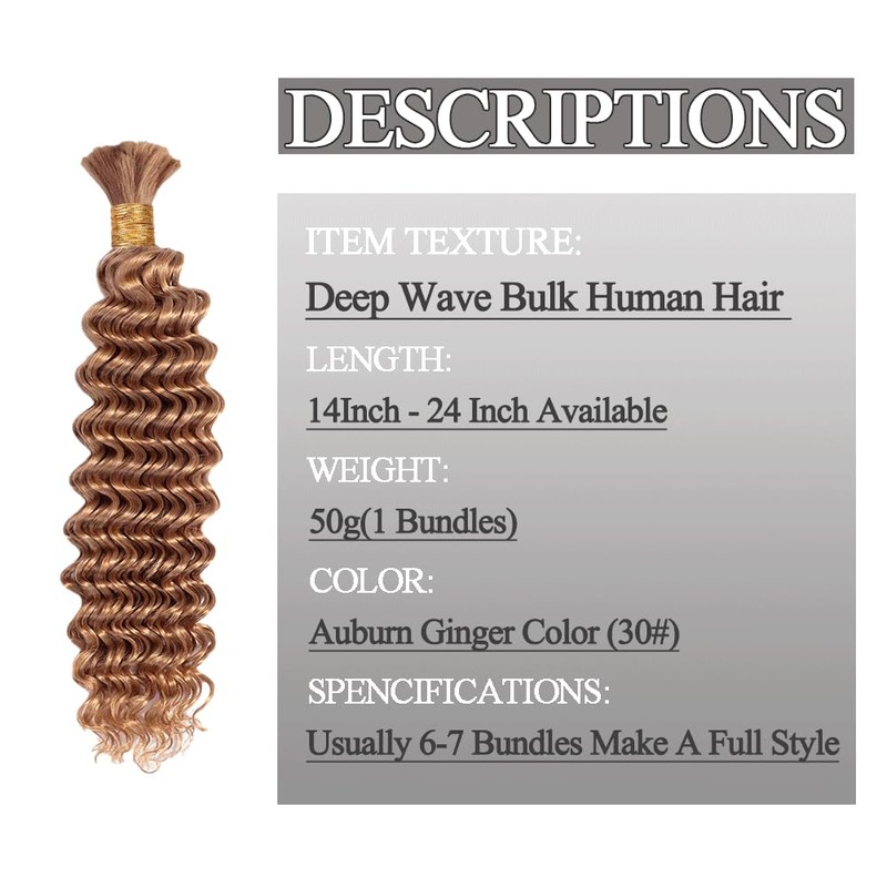- Specifications Of Deep Wave Bulk Auburn Ginger 30#: (50g/1Bundle) And (100g/2Bundles) Can Be Chosen, 14-24 Inches Available, You Could Choose The Quantity And Length Of Them According The Hairstyle You Want To Achieve (More People Choose To Purchase 100g+50g)