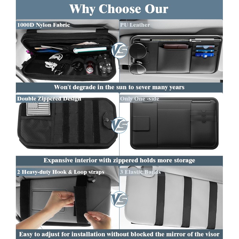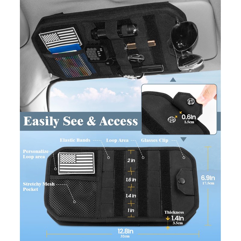 - Heavy Duty Visor Organization : 12.8 x 6.9 x 1.4 inches Sturdy tactical stylish look with Semi-rigid Molle Panel. Built with solid, thick 1000D Nylon Fabric material, it outperforms thin nylon or leathers. Double PE semi-rigid interior board won't bend or sag, keeping your driving essentials secure and organized and easy to access for years.