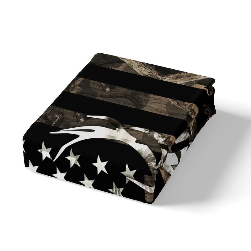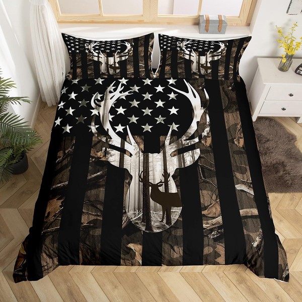 Deer Antlers Camo King Size Comforter Cover, Gray Camouflage American Flag Stars Stripes Print Duvet Cover Bedroom Decor, Wild Animal Hunting Farm Branches Leaves Bedding Set with 2 Pillowcases