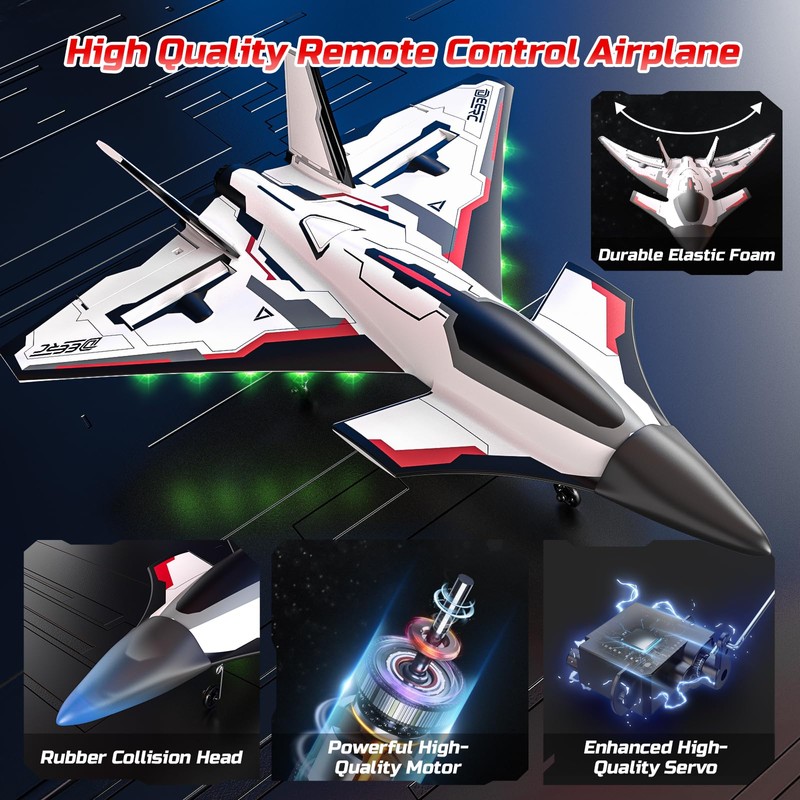 - Unique Design and Durability-Featuring bright LED lights and a futuristic paint scheme, this RC plane is visually stunning and sure to turn heads. Made from durable EPP foam and equipped with a silicone protective cover, it resists accidental impacts for longer-lasting fun. The LED lights not only enhance visibility during evening flights but also ensure your plane stands out in the sky.