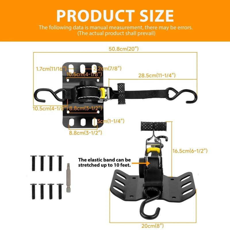 - 【Durable High-Quality Material】The bracket is made of high-quality iron with a thickness of 0.17 inches, it offers a sturdy construction and resists deformation. The ratchet strap is made of high-quality polyester to minimize wear and tear. Designed for long-term outdoor use and durability, the tie-down strap is 10 feet long and can tie down a variety of cargo. The bracket has a load capacity of 1300 lb, and the tightener has a load capacity of 450 lb.