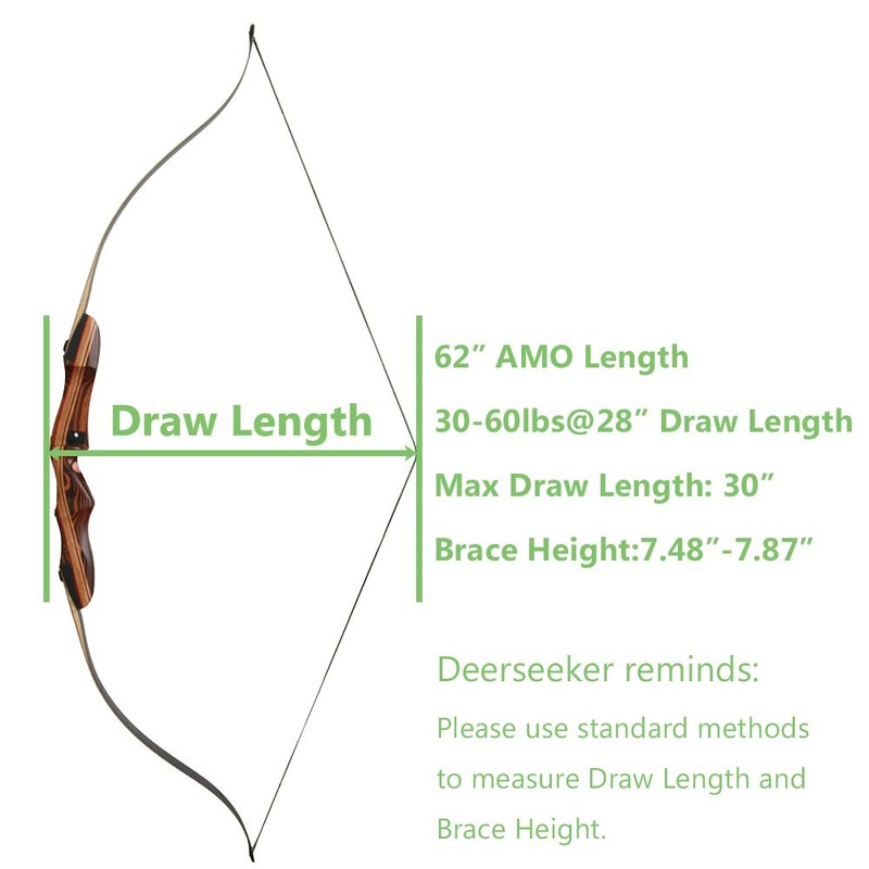 - Perfect and durable hunting bow - Deerseeker 62" recurve bow, take-down design and pack easy; max Draw Weight is 60 lb, perfect for hunting deer, elk, wild boar and bowfishing; min Draw Weight is 30 lb, friendly for beginner and target practice