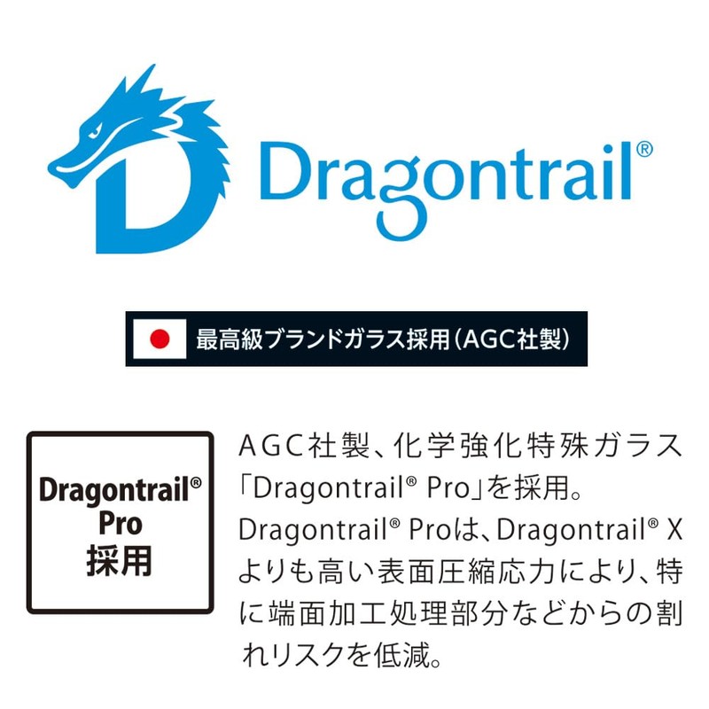 • Product Material: Glass (base material): AGC DragontrailPro, film (shatterproof treatment, adhesive)