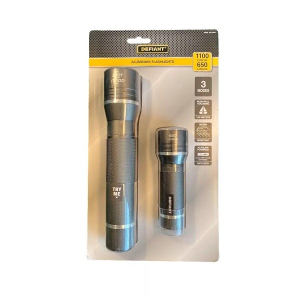 DEFIANT 1100 Lumens and 650 Lumens Alkaline Battery LED Powered Flashlight 2pk