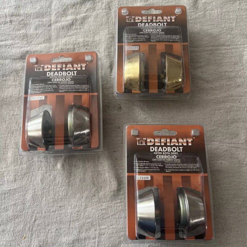 The Defiant Deadbolt is a new key-operated lock in a satin nickel and brass finish. It is designed to be keyed on both sides for added security. The model number is 72741 and it is manufactured by Defiant. This deadbolt comes with a key and has a brass finish.