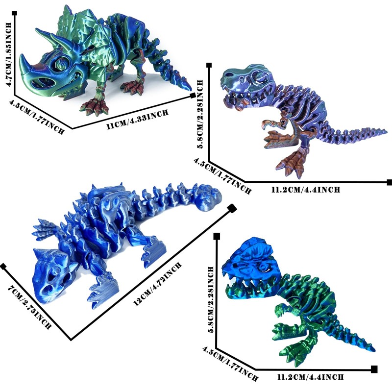 - 3D Printed Dinosaurs: You will receive 4 dinosaurs with different shape and colors and 2 bones. The color of the 3D printed dinosaur is unique, and different colors can be seen from different angles, giving us a great sense of visual impact