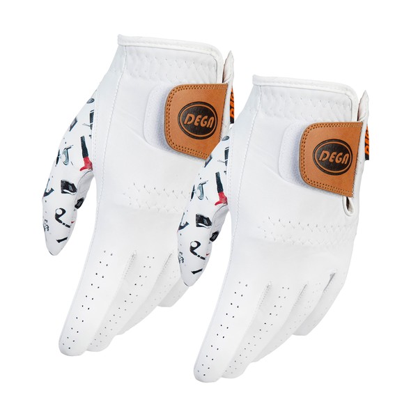 DEGA Golf Gloves 2 Pack 100% Cabretta Leather Golf Glove Men Left Hand Thumb Printed Designs (M/L, Golf Iconic)