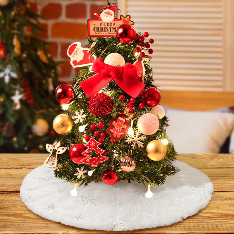 DegGod Plush Christmas Tree Skirts, 24 inches Luxury Snowy White Faux Fur Small Xmas Tree Base Cover Mat with Silver Snowflakes for Xmas New Year Home Party Decorations