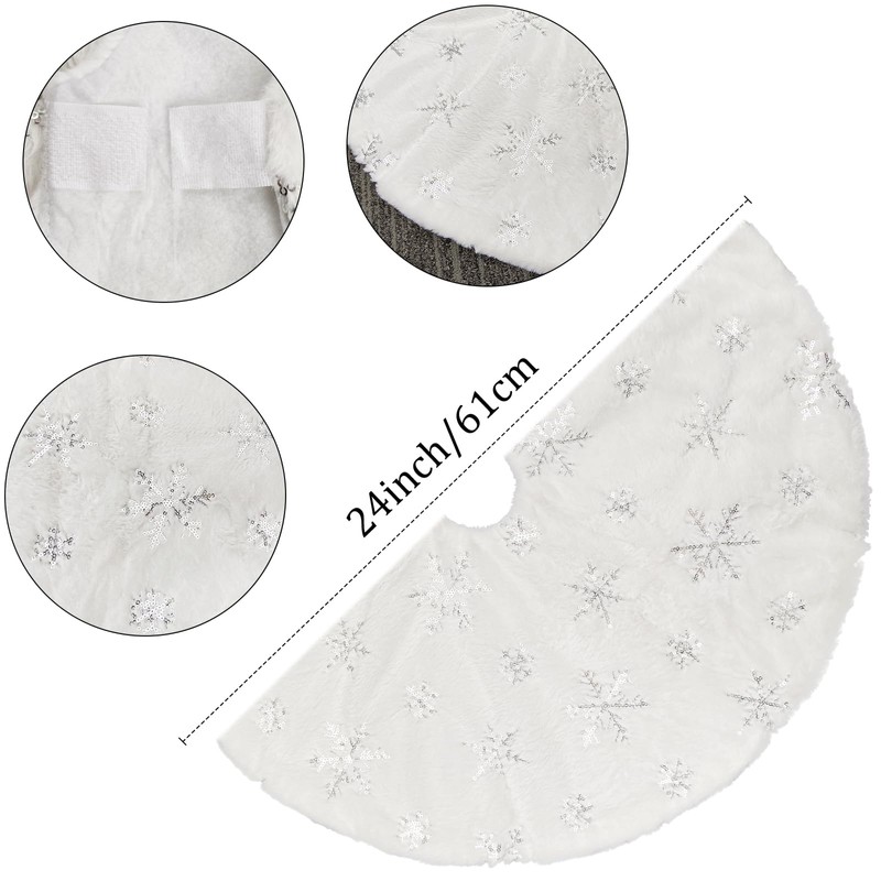 - 🎄 🎄 Soft and Warm Material: This 61cm / 24 inches Christmas tree skirt is made of faux fur. Double layer design, back with non-woven fabric and front with white faux fur and silver sequin embroidery snowflakes, high quality plush fabric material with soft and comfortable texture.