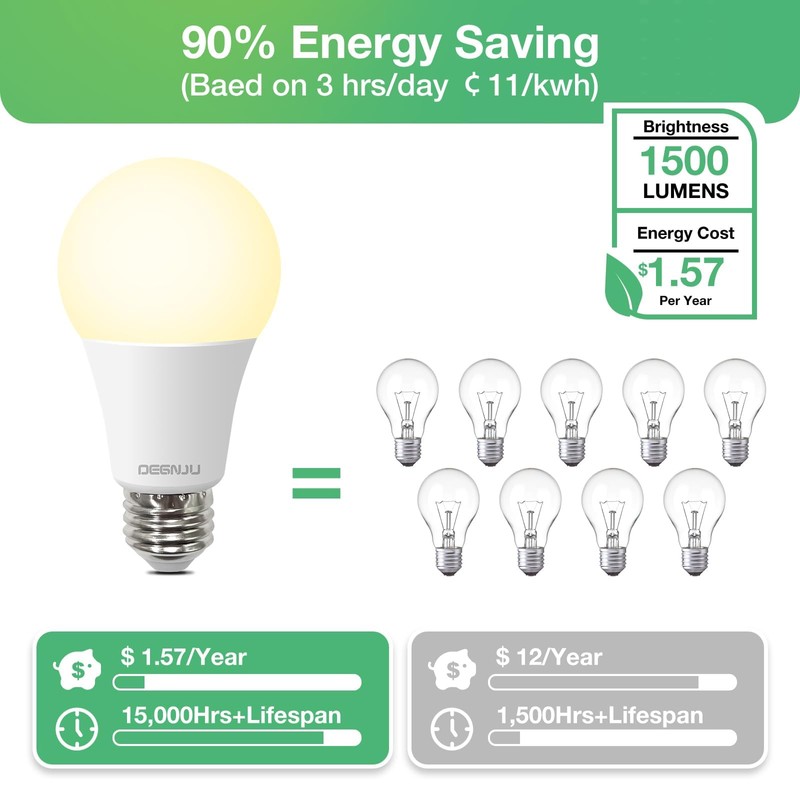 - 【Superior Energy Efficiency】Consume 87% less energy with DEGNJU's A19 LED bulbs, equivalent to 100W incandescent bulbs but using only 13 watts. Enjoy the same luminosity with better heat management, cutting your electricity costs significantly.