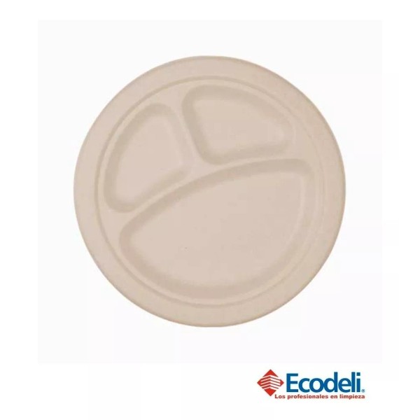 Plato redondo de 9" con 3 divisiones, hecho de bagazo de caña. Medidas: 23.5 cm. Paquete con 50 pzs.