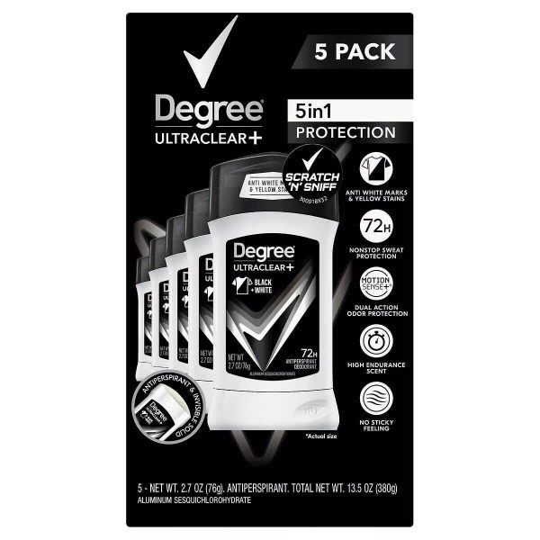 Degree Men UltraClear+ Antiperspirant Deodorant, Black & White, 2.7 Oz (5 Count) Anti white marks & yellow stains. With MotionSense Technology Degree Men 72-Hour Sweat and Odor Protection