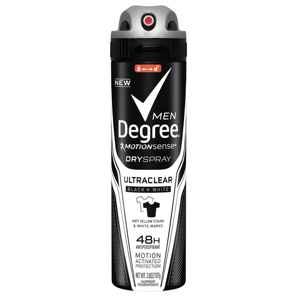 - Degree Men Dry Spray Antiperspirant Deodorant UltraClear Black plus White 3.8 ounce contains a modern masculine scent built on amber and woody notes