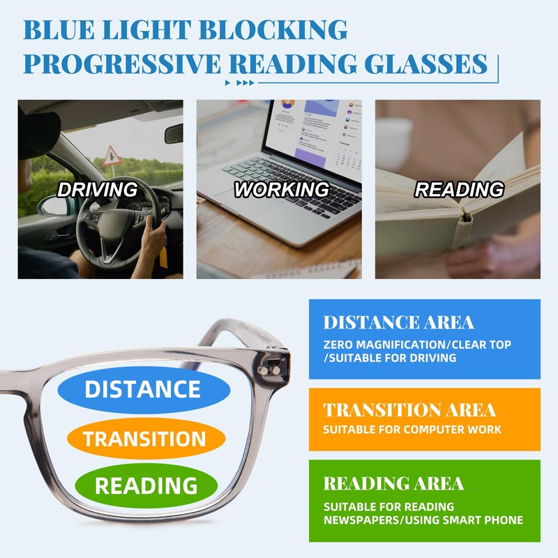 - 【Multifocus Reading Glasses】The progressive readers is designed to have 3 levels of vision to meet all your needs, top of the lens is clear(zero magnification), suitable for driving, walking and other 20ft distance view. Middle part is slightly reduced power for computer work. Bottom part is full-power for reading.