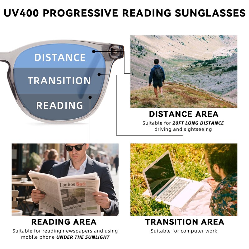 - 【Multifocal Reading Sunglasses】Progressive sun readers have 3 fields of vision to meet your needs. Top part is 0 magnification, suitable for driving, sightseeing and other 20ft distance view. Middle part is slightly reduced power magnification for computer work. Bottom part is full-power magnification for reading.
