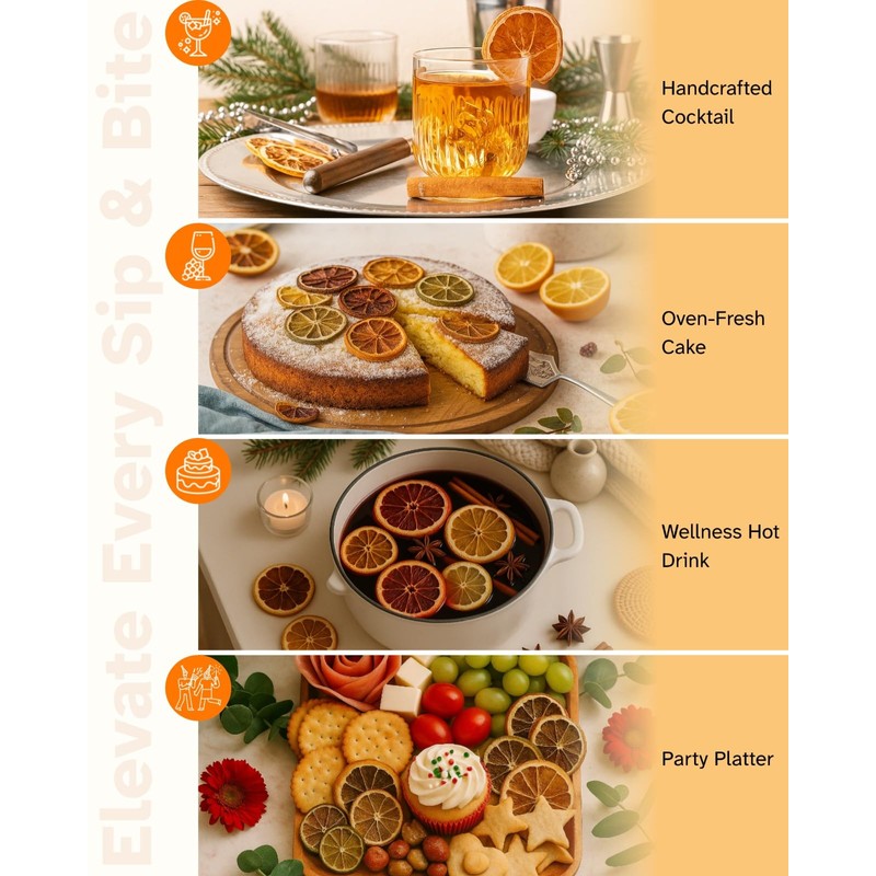 Bring the orchard to your glass—effortlessly. Our all-in-one garnish kit pairs naturally air-dried citrus slices with precision tweezers and 25 colorful cocktail paper umbrellas, so every drink, dessert, and table setting looks (and smells) like it came from a craft bar. No additives, just the bright beauty of real fruit.