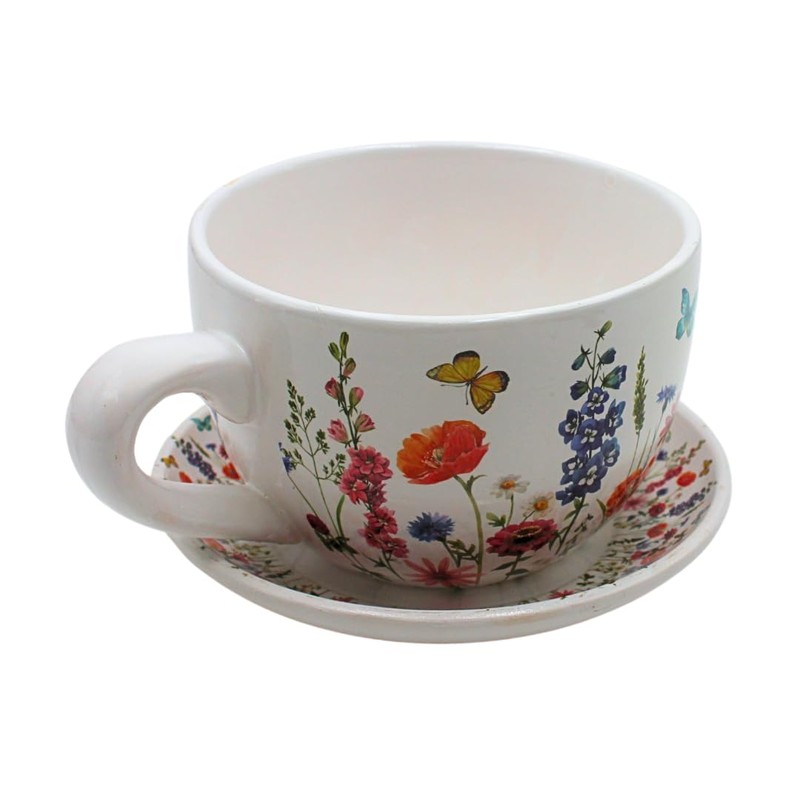 • DECORATIVE CUP SHAPED POTTER This ceramic planter with handle is an original eye-catcher. The hand-painted flower meadow motif and glazed surface make it ideal for succulents, herbs or flowering plants and add charming accents to windowsills, balconies or in the garden.