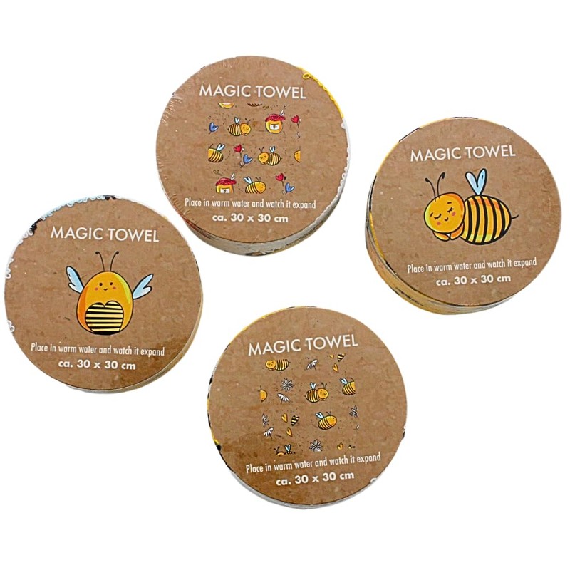 - These children's towels have the amazing ability to expand to the impressive size of 30 x 30 cm when in contact with water. The bee motifs of the wash mitts are colourful and appealing designed to delight children and make washing hands or drying after bathing a fun experience.