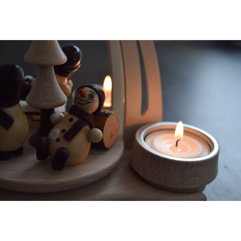 - Design: Turned snowmen, dimensions (L x W x H): 18 x 14 x 24 cm. Decorated with many small loving details. The mandatory impeller is powered by the heat of the burning tea lights. You will receive a very special and lovingly made Christmas pyramid, which has been made with great attention to detail. Selected materials "German beech wood", finest craftsmanship and a loving design are a beautiful decoration idea for any home.