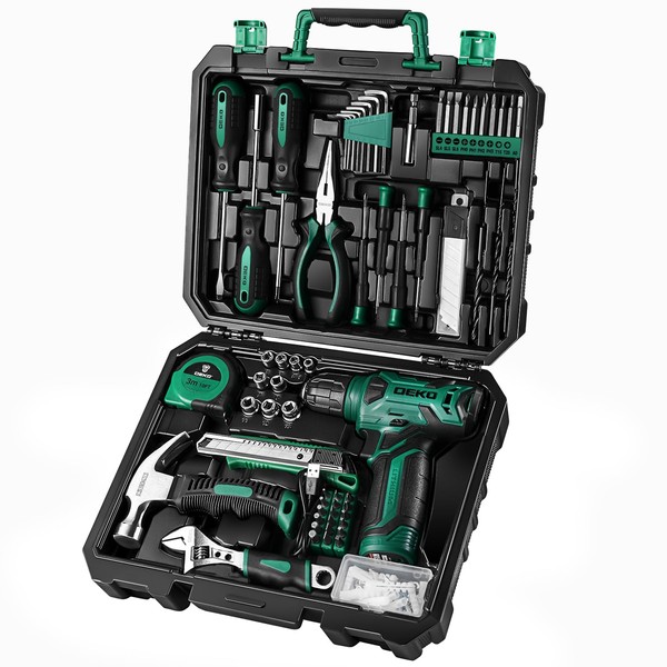 Tool Kit: 8V Cordless Drill, Home Toolbox with storage case, Hand Tool set for Home Repairs 126 Piece, Green