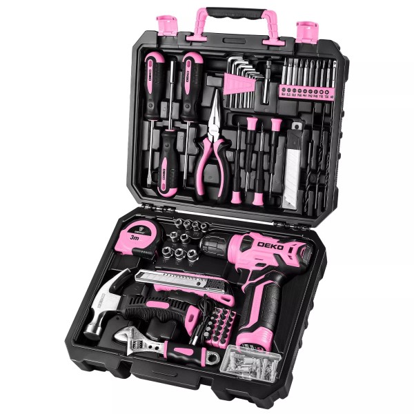 DEKOPRO Home Tool Kit with Pink Cordless Drill and Comprehensive Set 126 Piece