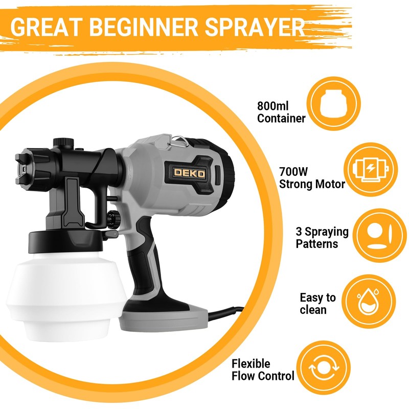 DEKOPRO Paint Sprayer, 700W Electric Spray Paint Gun for House Painting Furniture Cabinets Fence Walls Door Garden Chairs, Easy to Clean 4 Nozzles and 3 Patterns 800ml Container Gray