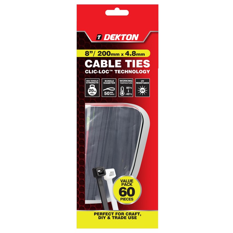Dekton 50PC Cable Tie Set - 4.8MM X 250MM White | Heavy Duty Industrial Strength | High Temperature Resistant | Self-Locking Teeth | Ideal for Cables, Piping, Gardening & Wires | Indoor & Outdoor Use