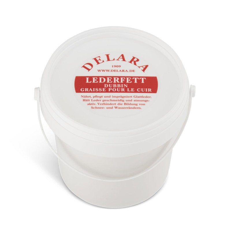DELARA Hochwertiges Lederfett, nährt, imprägniert und pflegt Schuhe, Taschen, Reitsättel und Möbel aus Leder, Eimer mit 500 ml, farblos - Made in Germany