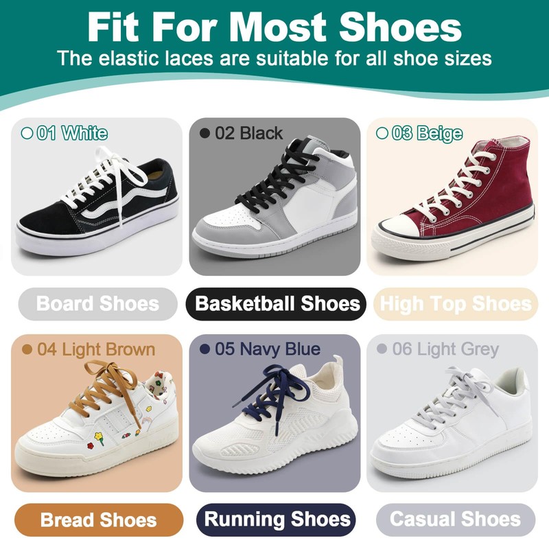 - Fit For Most Shoes: See pictures, convenient slip-on design, say goodbye to constantly tying and retying your shoelaces; We offer your choice of 6 colors and a variety of lengths to meet different needs on various occasions. Flat laces are perfect for fashion sneakers, white shoes, running shoes, athletic shoes, canvas shoes, casual shoes, boots and more