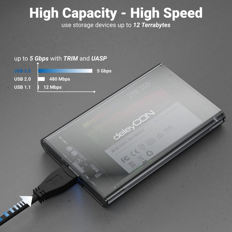 deleyCON SSD Hard Drive Enclosure USB 3.1 Gen 1 for 2.5 Inch SATA 3 SSD / HDD / 7 mm / 9.5 mm SATA III Hard Drives External Enclosure UASP [Transparent Grey]