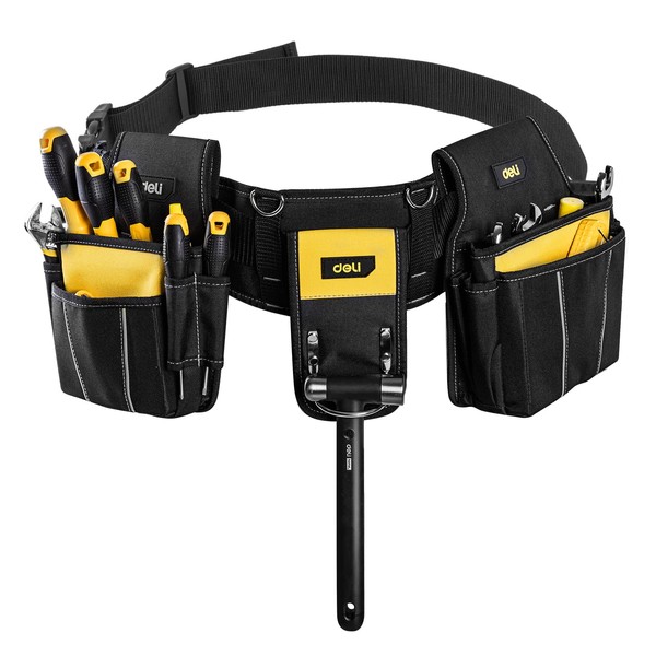 DELI 22 Pocket Black and Yellow Heavy Duty Tool Belt for Man, Construction Tool Belt, Work Apron, Tool Pouch, with Poly Web Belt Quick Release Buckle Adjustable Max Up to 50"