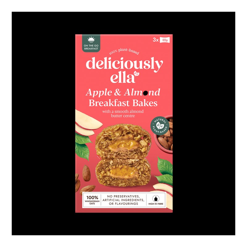 Apple and almond soft baked oat biscuit filled with almond butter No Preservatives Artificial Ingredients or Flavourings Gluten Free Vegan Friendly Packed with oats, apple pieces and a creamy almond butter centre, our Apple & Almond Breakfast Bakes are perfect for busy mornings when you need a quick and delicious breakfast on the move. Naturally high in fibre and packed with natural, plant-based ingredients, our bakes give you energy to start your day. These breakfast bakes are high in manganese which contributes to normal energy yielding metabolism. Discover delicious ways with Deliciously Ella. Always natural, Always plant-based Always natural, Always plant-based As with all Deliciously Ella products, our breakfast bakes are made using natural ingredients only. You won't find any preservatives, emulsifiers, flavourings or additives. For thousands of plant-based recipes, join our community at deliciouslyella.com Enjoy as part of a varied and balanced diet and a healthy lifestyle.