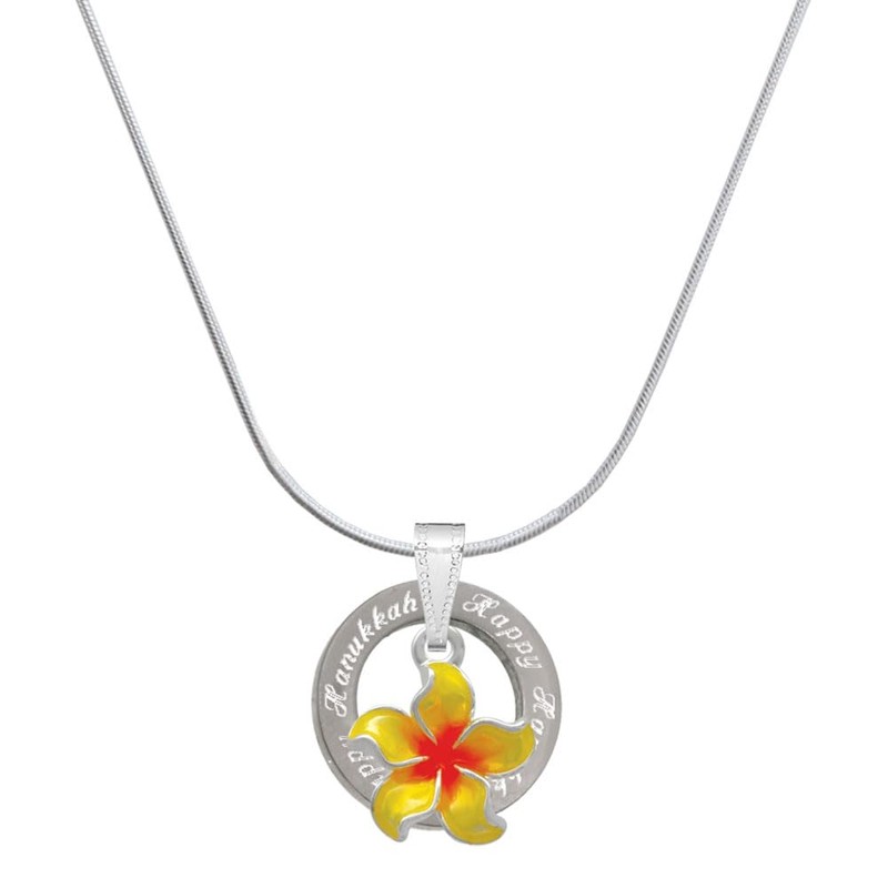 - Silvertone Yellow and Orange Plumeria Flower - Silvertone Happy Hanukkah Message Ring Necklace, 18".