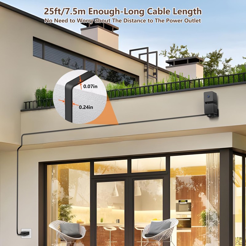 - 【25FT/7.5M Flat Cable】 25ft/7.5m Extra-Long Cable for flexible camera placement wherever you prefer. Only 2mm thickness, Flat cable can easily fit through tight spaces like doors and windows, prevent tangling and save space.