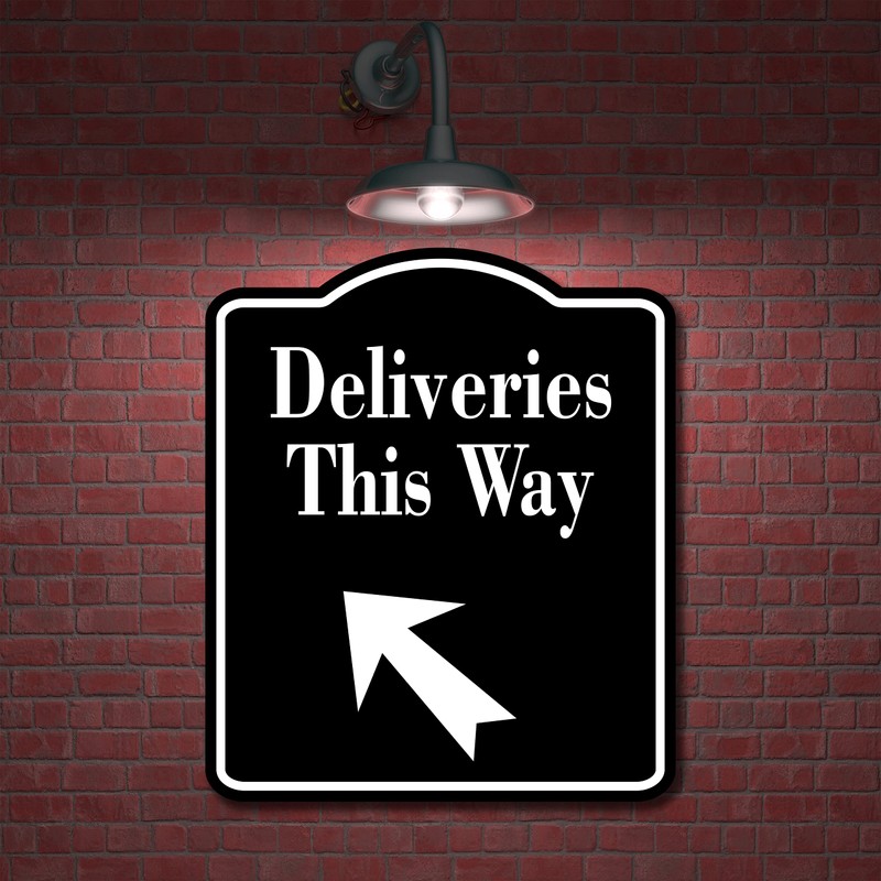 Deliveries This Way 45 Degree Up Left Arrow BLACK Aluminum Composite Sign, 8.5"x10"