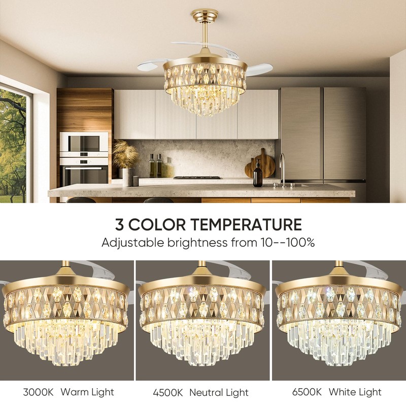 - 【Stepless Dimmable & Color Changing】This chandelier ceiling fan features three adjustable color temperatures: warm (3000K), neutral (4500K), and white light (6500K). The brightness is fully adjustable from 10% to 100%, giving you the flexibility to create the perfect lighting for any occasion—whether you're relaxing, working, or hosting guests. The versatile LED light not only enhances ambiance but is also energy-efficient and eye-friendly.
