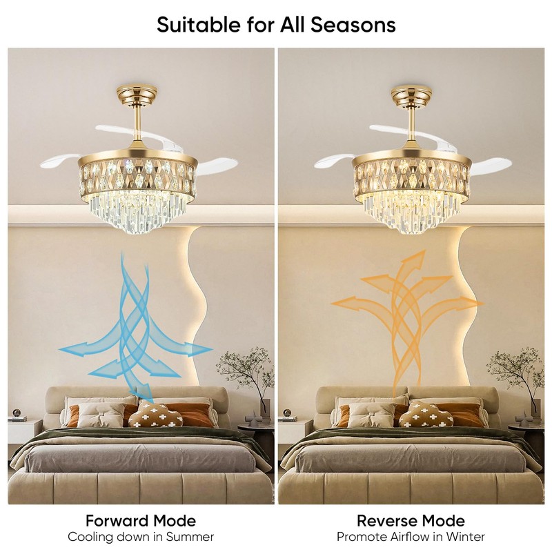 - 【Silent DC Motor & Retractable Blades】The advanced DC motor is 45% more energy-efficient than traditional AC motors and runs quietly even at high speeds. Crafted with pure copper and silicon steel for durability, the motor ensures long-lasting, smooth performance. The retractable blades automatically open when the fan is in use and retract when turned off, maintaining a sleek chandelier appearance. Fan and light can be operated independently.