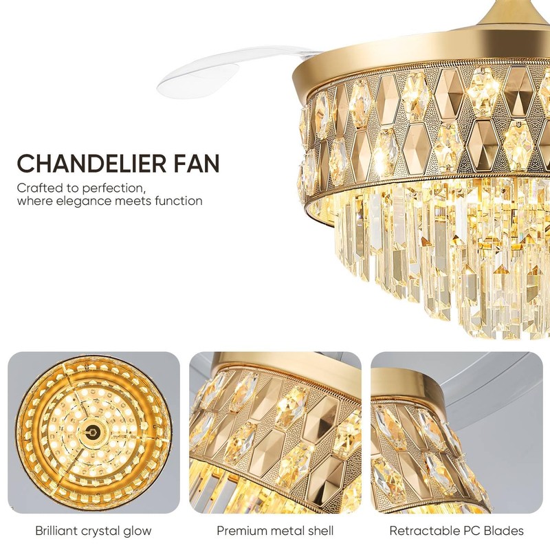 Deliyfans 42" Fandelier Ceiling Fan with Light, Chandelier Fan, Retractable Crystal Ceiling Fan Dimmable LED, 3 Color Temperatures, 6 Speeds, for Bedroom & Living Room