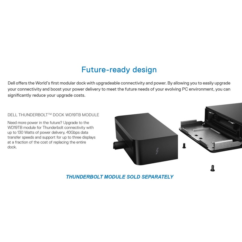Dell dock – WD19 130W. Boost your PC’s power on the world’s most powerful and first modular USB-C dock with a future-ready design. Recommended and compatible systems: Latitude Series: 3301, 3390, 3400, 3490, 3500, 3590, 5280, 5285, 5290, 5300, 5400, 5401, 5480, 5490, 5500, 5501, 5580, 5590, 7200, 7280, 7285, 7300, 7380, 7389, 7390, 7400, 7480, 7490. Rugged Series: 5420, 5424, 7424. Xps series: 9360, 9365, 9370, 9380. Note: This docking station includes a 130W power adapter, but only delivers 90W of power to the laptop due to the power requirements of the dock itself. Built for the future. Mix and match: evolve as your needs change with our most versatile dock. The future-ready design lets you swap out modules with ease If you need to do field replacements or upgrade your systems. Ultimate connectivity: USB-C connectivity makes it easier than ever to deliver power, data, audio and video in one convenient cable, No matter what system You use. Clean and clutter-free: stay productive by mounting your dock behind your monitor or under your desk with the optional, secure VESA mount, that offers Complete flexibility With the built-in one-meter cable. Information in a flash: with data transfer speeds of up to 10gbps, you can stay productive when connected to all your devices. Optimize your workspace. Smooth and seamless: work without disruptions utilizing a single firmware on our most manageable docks ever. Plus, with Dell Client command Suite and Microsoft system Center configuration Manager, you can quickly and easily update your firmware without rebooting your dock. Secure Manageability: keep your information safe with Mac address pass-thru and remote port-disablement. Plus, with features like PXE Boot, wake-on-lan and more, It’s easier than ever to stay.