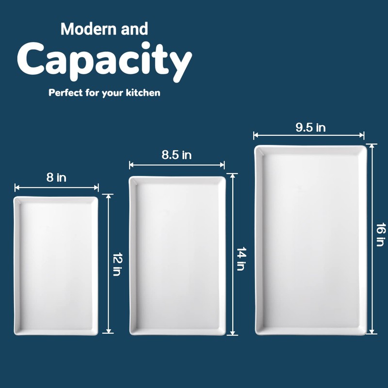 - Large Serving Platters Set: With 3 different sizes, large: 16x 9.5-inch, medium: 14 x 8.5-inch, small: 12 x 8-inch, these serving plates will meet your daily use—— suit for serving cupcakes, snacks, turkey, dessert, sandwiches and chips/salad.