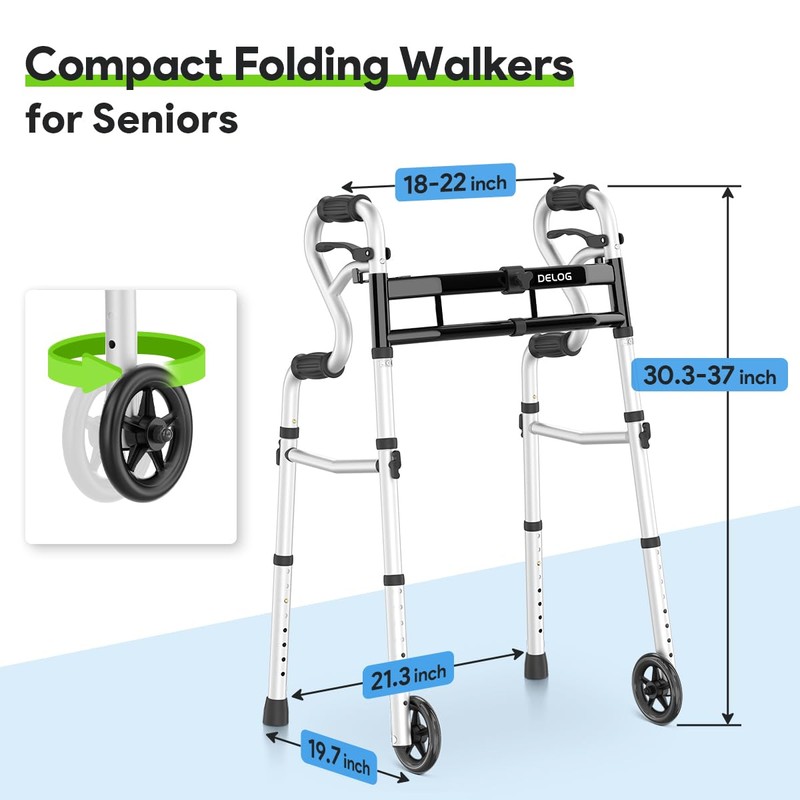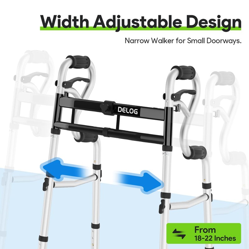 - Width Adajustable Design: Different to normal 2 wheels walker, you can also adjust the width of Delog folding walker with wheels from 18 inches to 22 inches; Easy to transfer in and out of vehicles. Walkers for narrow doors : Idea for indoor and outdoor.Especially for travelling.