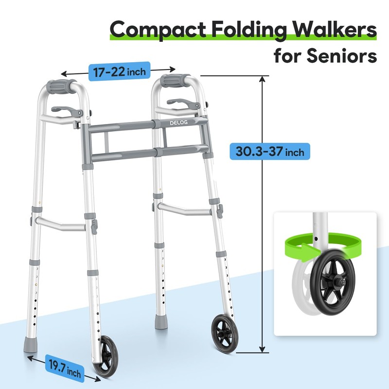 - Easy To Move: Delog Folding walker have 5 inch wheels glide smoothly over various surfaces. Making this the perfect walker for indoor and outdoor use.