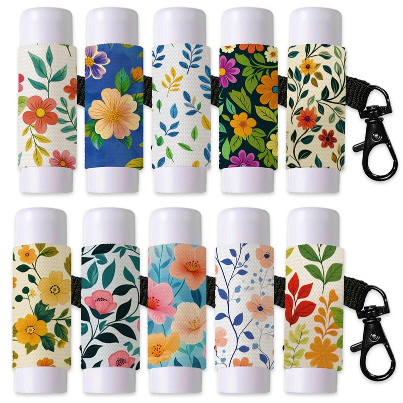 DELORIGIN Pack of 10 Lip Balm Holder Key Ring Lipstick Cases with Metal Clasp Elastic Lip Covers for Lip Balm Chapstick Storage, Plants Flowers
